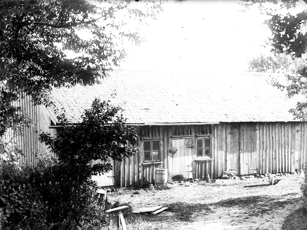 Byggnad. Hus. Låg länga. Kombinerat bonings- och vedhus?