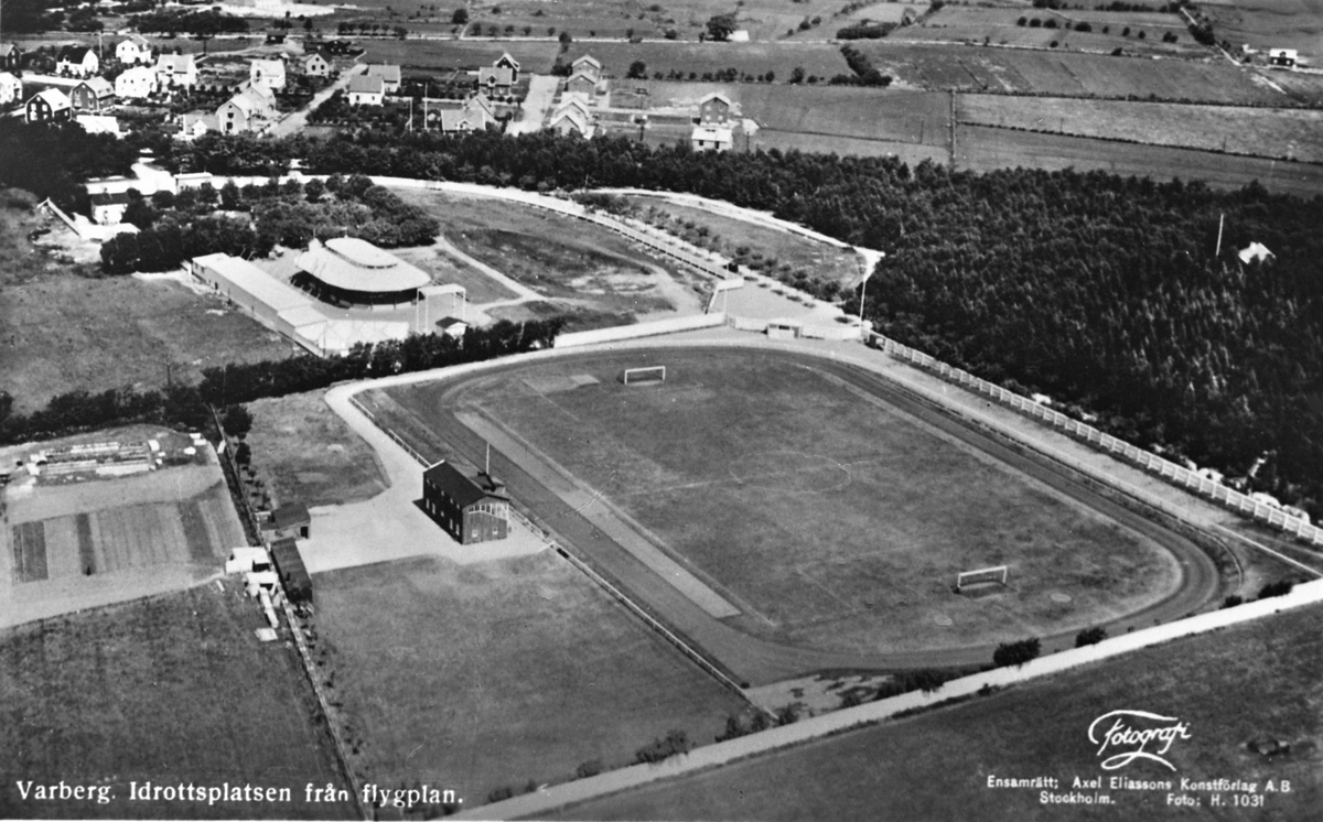 Vykort, "Varberg. Idrottsplatsen från flygplan." Flygbild över Varbergs idrottsplats, Påskbergsvallen. I bildens ovankant ses fr v kvarteren Måsen, Fevern, Lygnern och Draen. Tranebergsgatan går igenom kvarteren och ovanför villorna ses Träslövsvägen. De korta vägstumparna mellan husen är Svanegatan till vänster och Tjädervägen till höger.