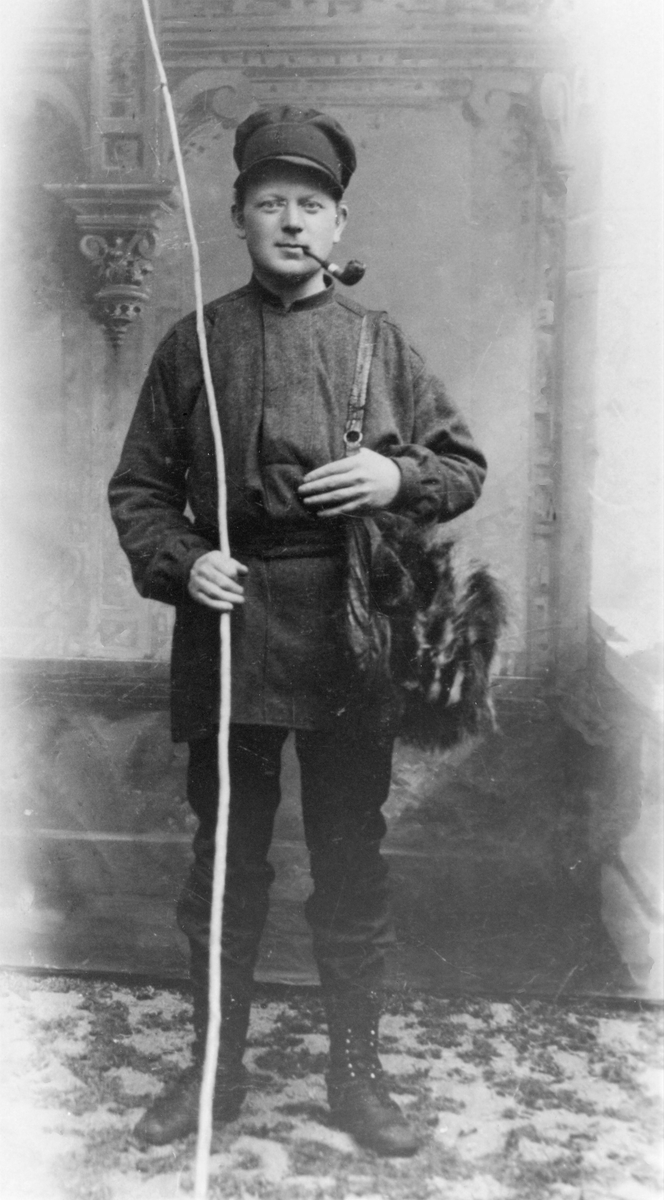 Ateljéporträtt av en ung August Bondeson iförd kolt, smala byxor, höga kängor och en mössa med skärm. En jaktväska hänger på ena axeln, i mungipan en pipa och i ena handen håller han ett fiskespö. Troligen var detta en av hans karaktärer som han uppträdde på soaréer under studietiden, då han sjön, spellade och berättade sagor och historier. Denne skomakarson från Vessige blev med tiden en känd folklivsforskare, författare och läkare.