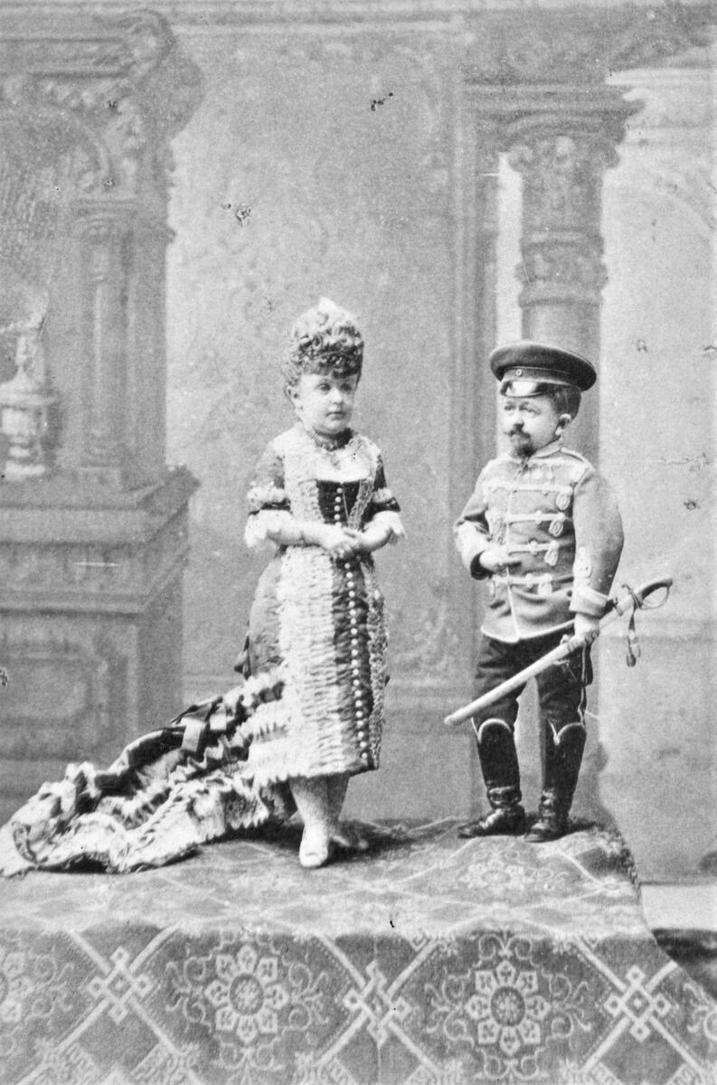 Från August Bondesons vänkrets. Ett kortvuxet par där mannen är klädd i uniform med något slags svärd och kvinnan bär en klänning med släp. Fotografiet är taget i Alexandria, Egypten.