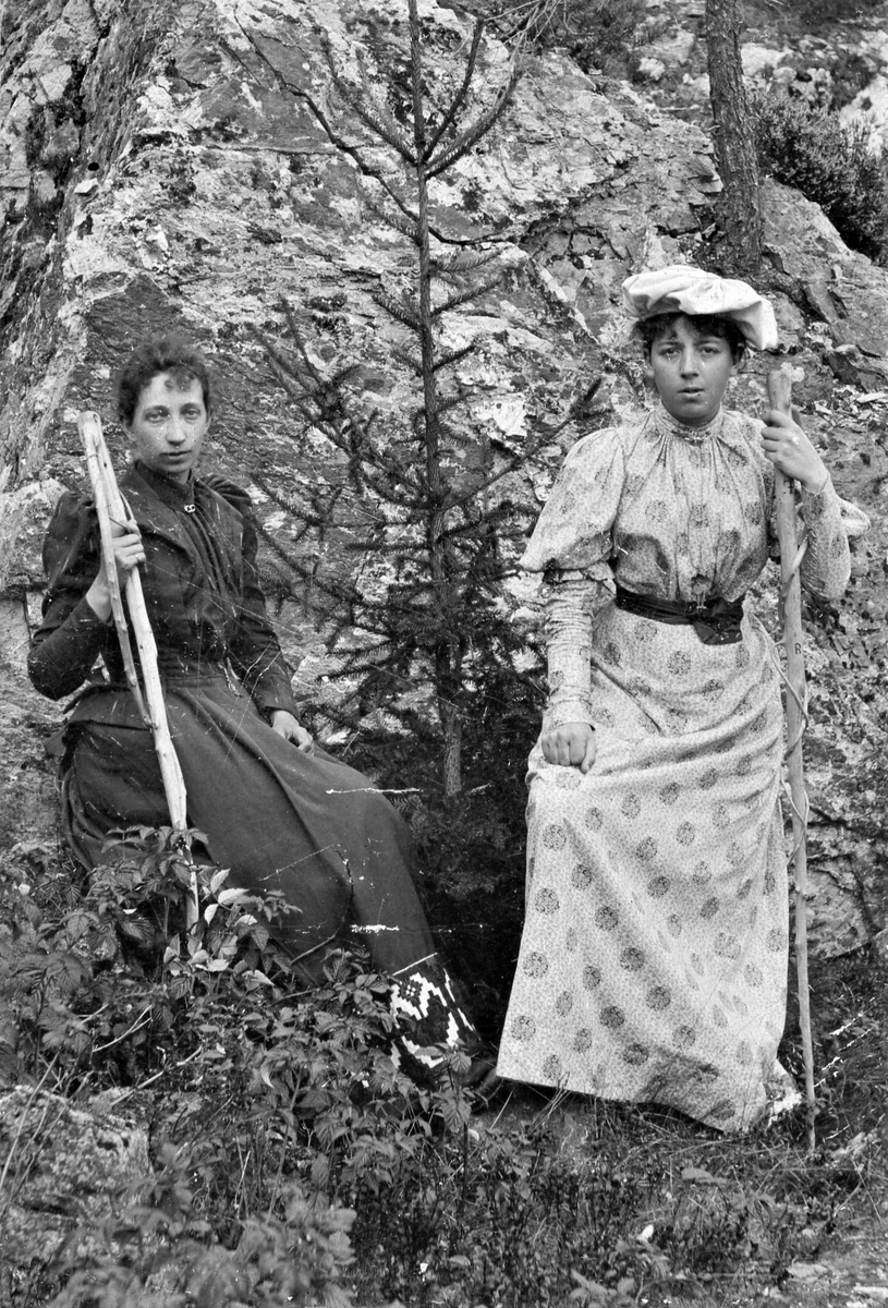 Från August Bondesons fotosamling. Anteckning på fotografiets baksida: "Sommaren 1893." Två kvinnor ute i naturen vid ett stenblock eller berg. De har varsin stav lindade med snören. Kvinnan till höger liknar konstnärinnan Hanna Pauli och Bondeson var bekant med hennes make konstnären Georg Pauli (se bildnr VMA6586_3). De gifte sig 1887.