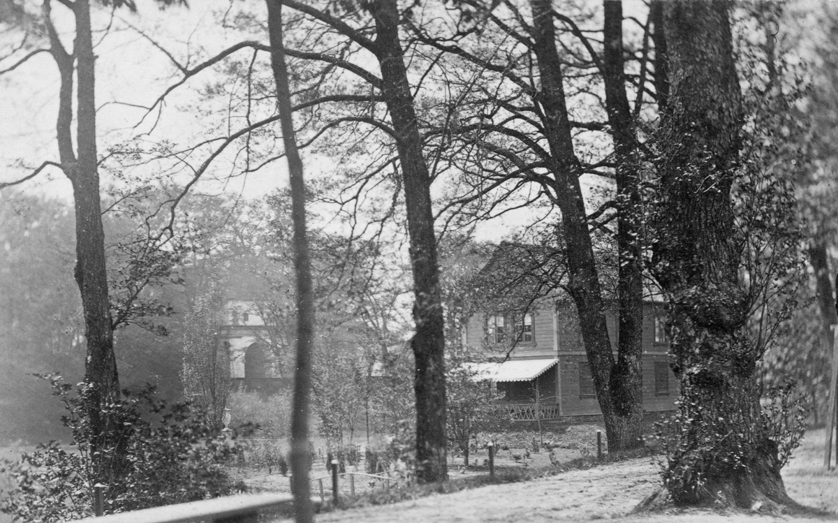 Från August Bondesons fotosamling. Anteckning på fotografiets baksida: "Parti af Halmstad Tivoli", dvs Tivoliparken som etablerades på 1840-talet och numera kallas Norre Katts park. I bakgrunden ses Norre Port och mellan träden skymtar en av byggnaderna i parken.