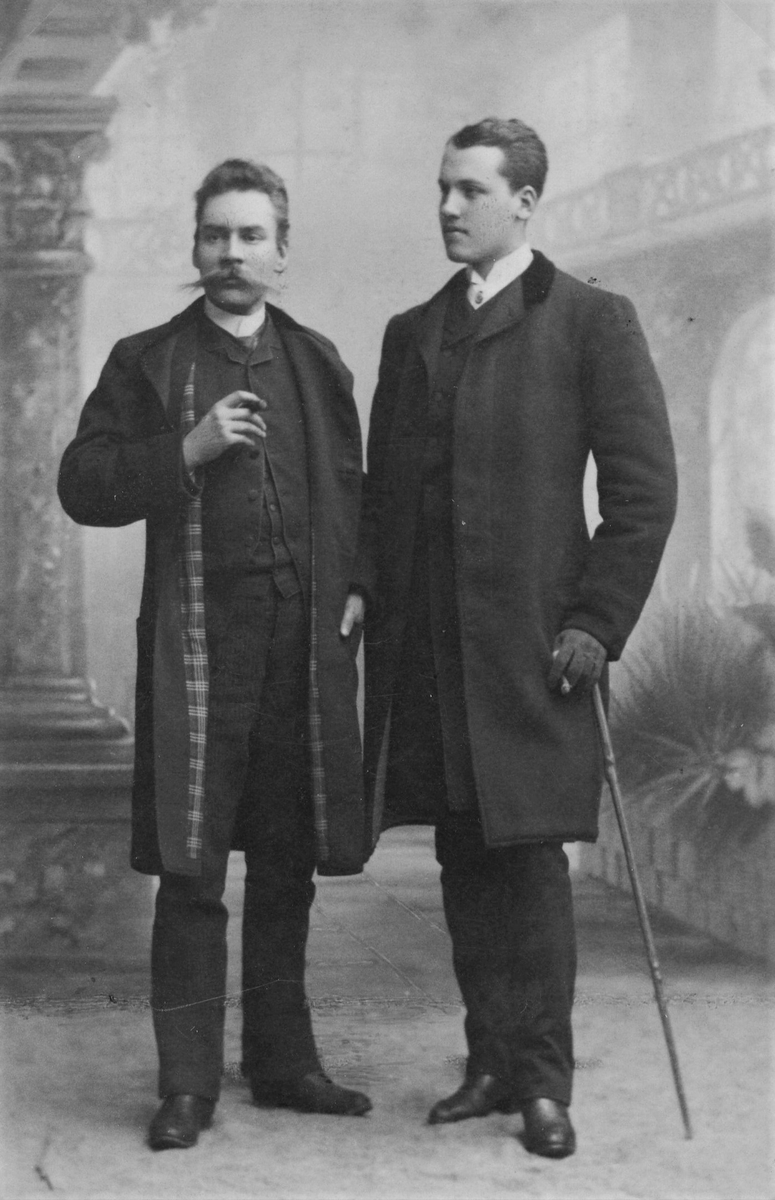 Från August Bondsesons vänkrets. Två unga herrar i ytterkläder fotograferade hos Nils Björsell i Stockholm. Den ene hålller i en cigarr och den andre i en käpp.
