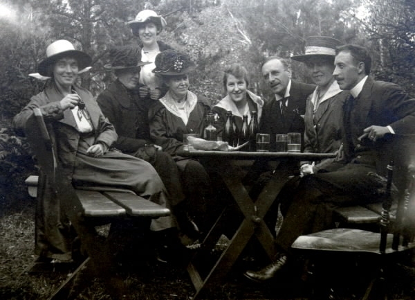 Mathilda Ranch med sällskap i umgänge kring ett trädgårdsbord med buteljer och glas. Troligen i Åsbro.. Mathilda sitter som nummer tre från vänster, med systern Nathalia Ranch till vänster i bild och de yngre kvinnorna är Nathalias döttrar. Mannen längst till höger röker cigarr och kvinnan längst till vänster har en pipa. Fotograf troligen Mathilda Ranch.
