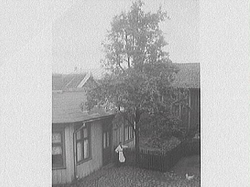 En kvinna och en höna på en kullerstensbelagd bakgård i staden. Kvinnan står vid ett staket och ett högt lövträd. Troligen Mathilda Ranchs bakgård.