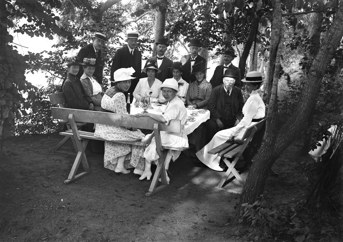 "Åsbroklubben" sitter vid en trädgårdsmöbel i en träddunge. Från vänster: fröken Sara Sjöberg, fru Maria Sjöberg, fru Svenander (stadshuset), Greta Sjöberg, fru Hulda Lindh, Axel Lindén, Nathalia Alling, Sofia Rylander, Anna Wennerholm. Stående från vänster: Oscar Nordblom, Harry Svenander, Ernst Rylander, Frans Wennerholm, Hjalmar Sjöberg. Nathalia och Hulda är systrar till fotografen.