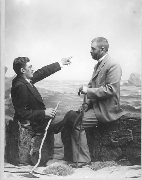 Atlejéfoto av specerihandlare Oscar Pehrson till vänster och August Börjesson till höger. August Börjesson var linnehandlare i Göteborg. Scenen är arrangerad som att de sitter vid havet på en mur och samtalar; Oscar pekar utåt "havet" och har en pinne i handen, August har en käpp.