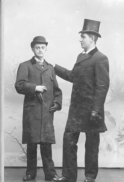 Mansporträtt av två herrar klädda i hatt och rock. Mannen till höger i hög hatt är handlanden Oscar Pehrson.