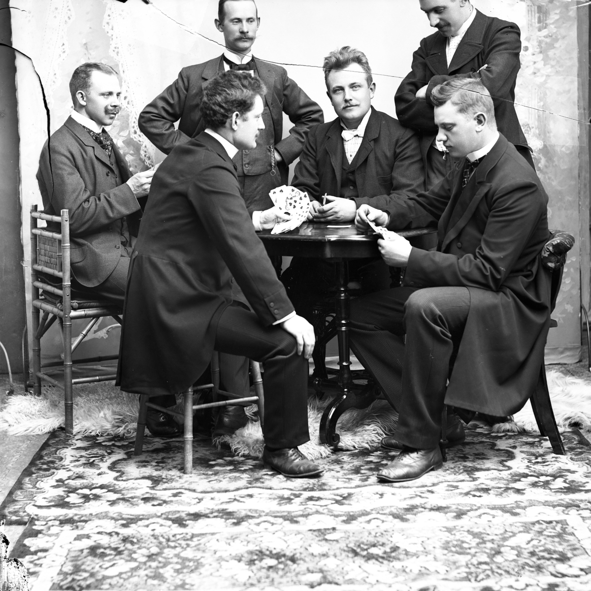 "Kortspel. Mannen i mitten som tittar in i kameran är Elof Ernwald. Sittande längst till höger: Oscar Nordblom, övriga är Oscar Pehrsson(stående till höger), Ernst Rylander(stående till vänster), grosshandlare Carl Andersson (sittande till vänster) samt skräddaremästare Knut Svensson (i profil till vänster). Till bilden finns text: "Klubben 1902"