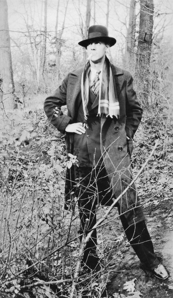 Ur Oscar Nordbloms samlingar. Anteckning på fotografiets baksida: ”Gustaf 1928”. Eftersom Konstnären Gustaf Nordblom dog 1927 bör detta vara hans son Gustaf Oskar Emil. Han står ute i naturen på okänd plats i hatt, sjal och rock med en cigarett i mungipan. Varken fotograf eller årtal är känt.