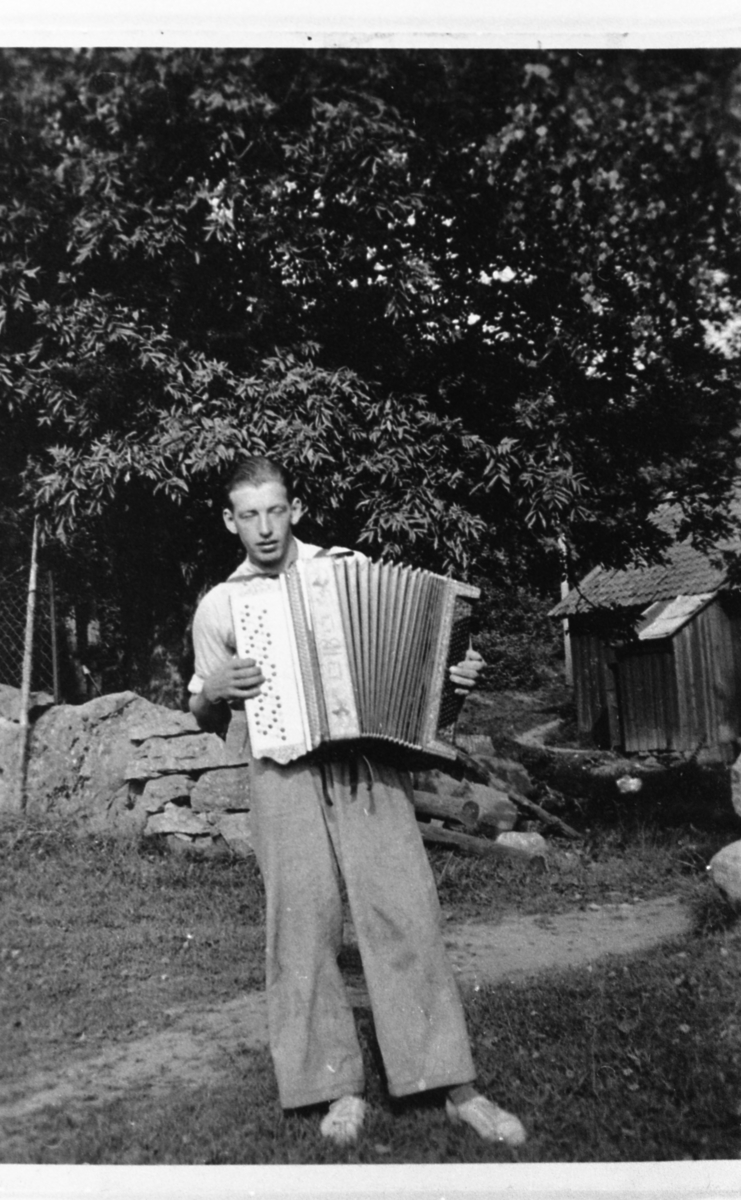 Vommedal/Tulebo "Ljungåsen". Nils "Nisse" Winqvist (1911 - 1986) står i en trädgård och spelar dragspel, okänt årtal. Fotot taget på nuvarande Olas väg.