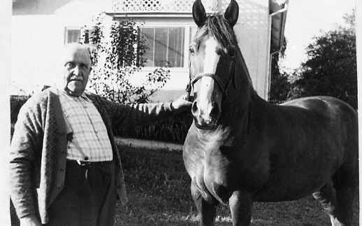 Viktor Larsson (1878 - 1967) står och håller en häst, "Larssons" Bölet 1950-tal.