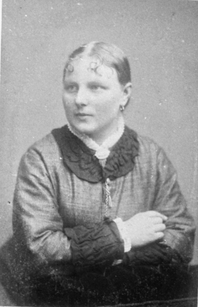 Ateljéporträtt av Ada Johansson, Heljered Västergård "Olas", okänt årtal. Född 1879, död i USA. Emigrerade till USA 1905, gift Lowell, omgift Terweksbury. Ada skickade några brev till sin syster Hilda mellan åren 1905 - 1907 som finns bevarade i föreningens arkiv (se KH000764).