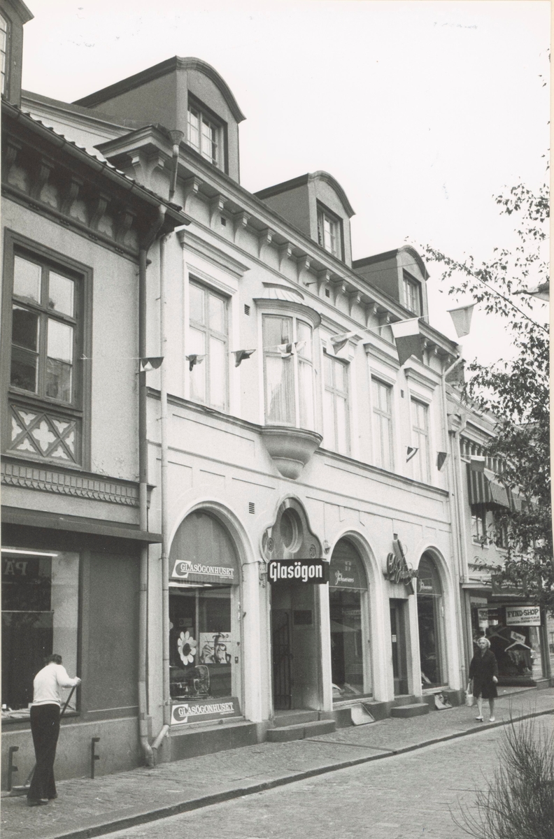 En optiker i en affärsbyggnad. Fasad mot Storgatan, Kvarnholmen väster om Västra Sjögatan. Bilderna är tagna inom ramen för Kalmar kommuns inventering av Kvarnholmens bebyggelse 1970-1971 och skänkta till länsmuseet.