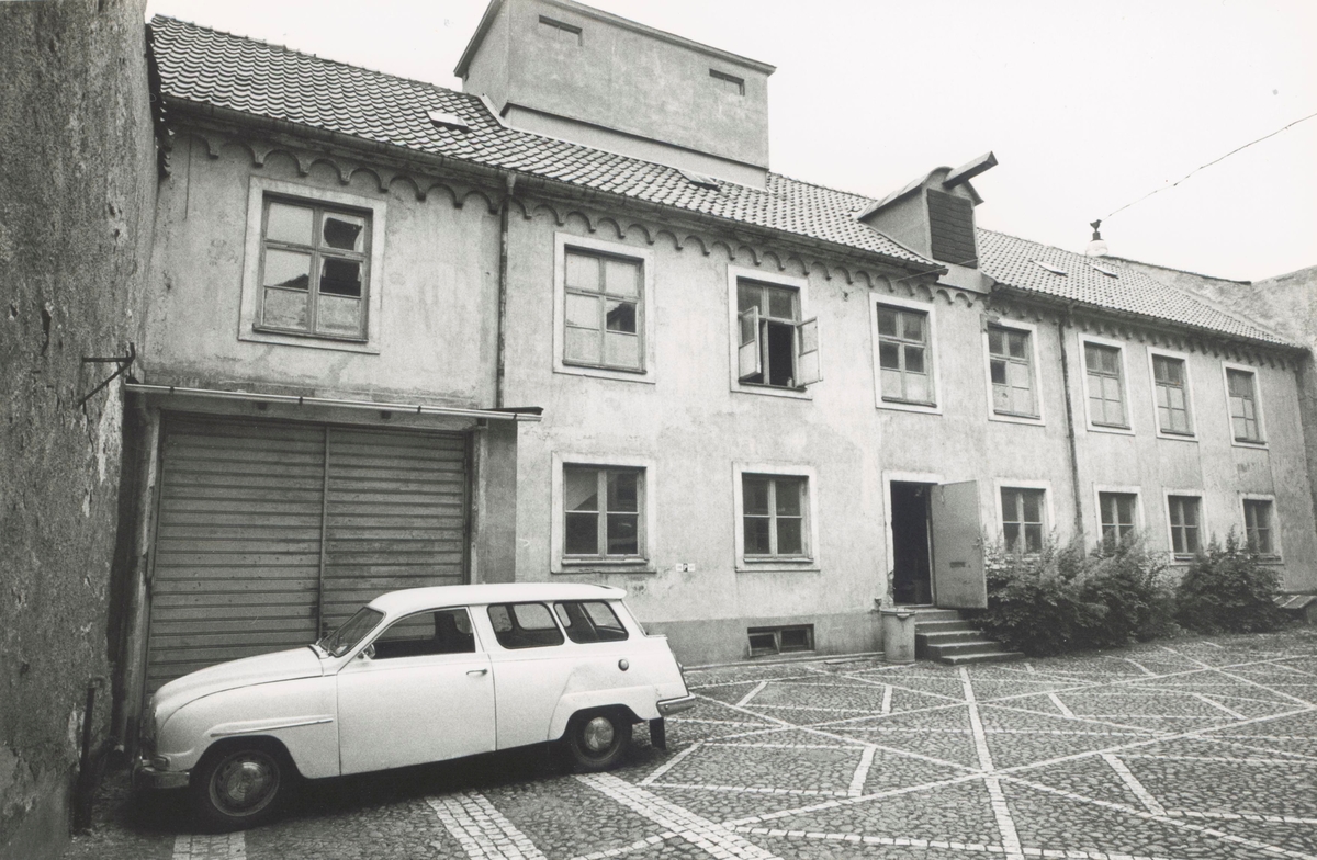 Gårdsfasad, en innergård med stenläggning. Kvarnholmen väster om Västra Sjögatan. Bilderna är tagna inom ramen för Kalmar kommuns inventering av Kvarnholmens bebyggelse 1970-1971 och skänkta till länsmuseet.