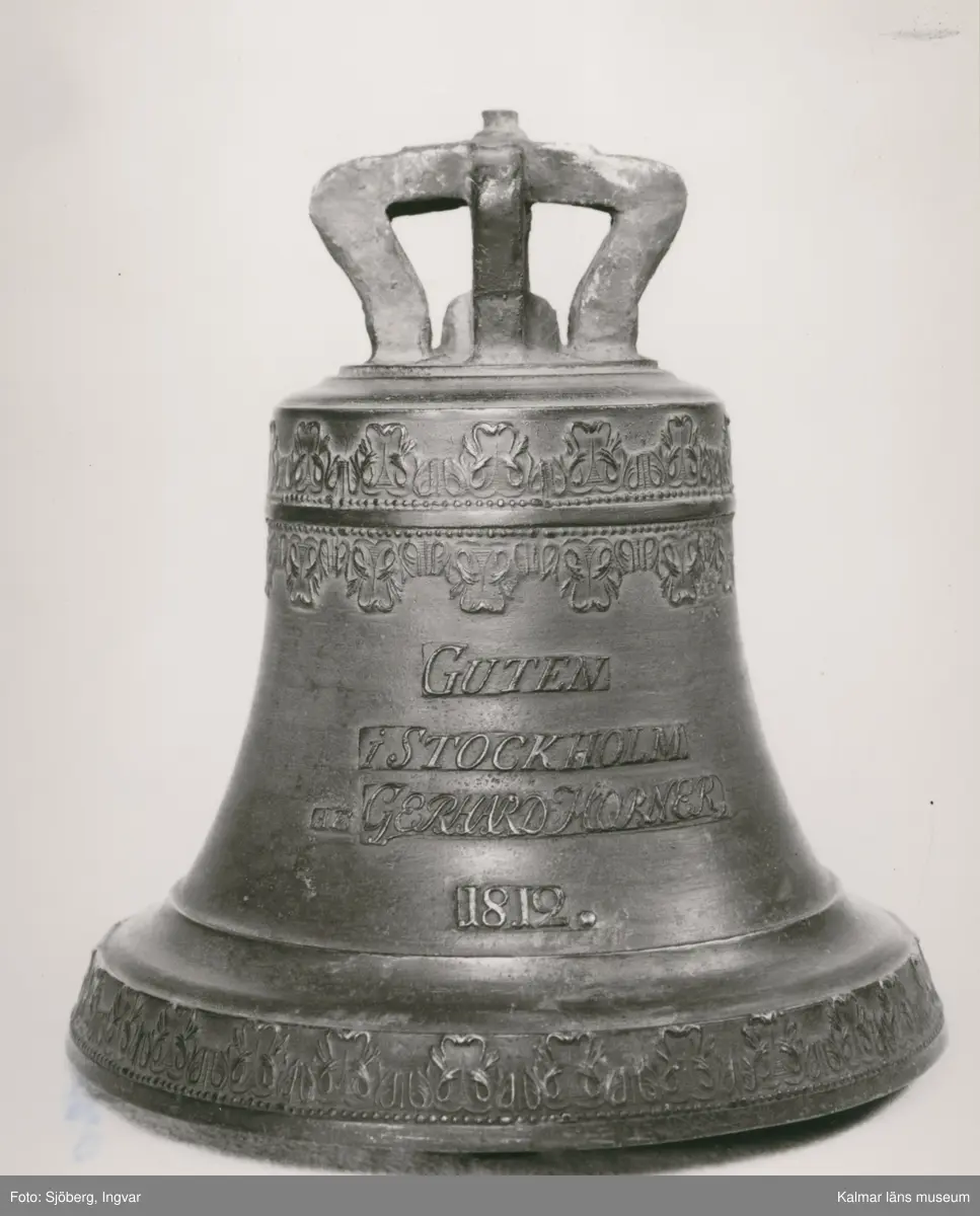 Tingsklockan tillverkad i malm, gjuten av Gerhard Horner i Stockholm 1812. Till vänster om G i Gerhard synes en inslagen stämpel AE vilket bör stå för gjutaren.