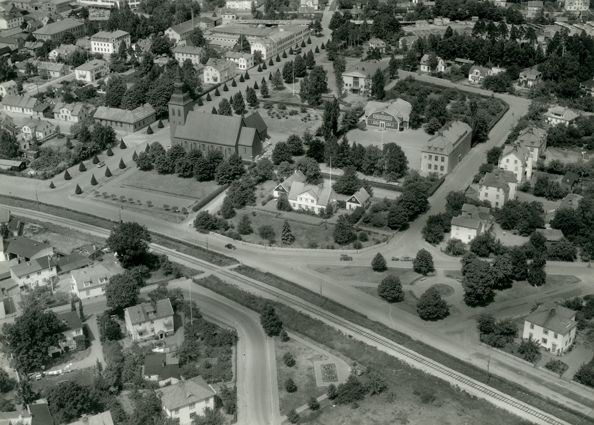 Flygfoto över Nybro centrum, Paradiset. Nybro kyrka och järnväg.