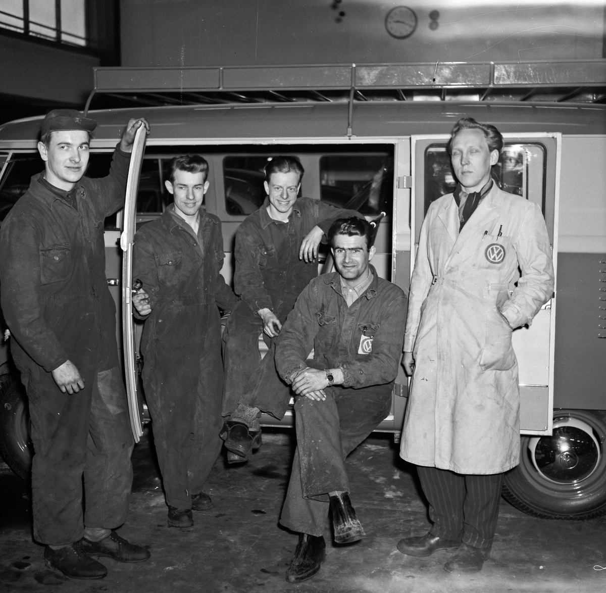 Bil & Buss i Gävle, verkstadspersonal tillsammans med en Volkswagen buss