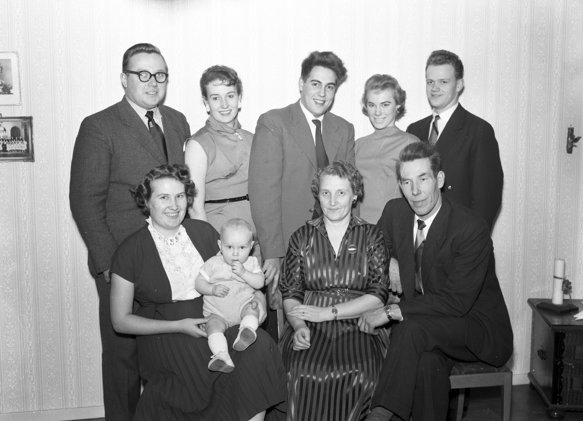 Ingvar Åberg (sittandes längst till höger i bild) med sin fru, sina barn och deras respektive partners samt barnbarn.