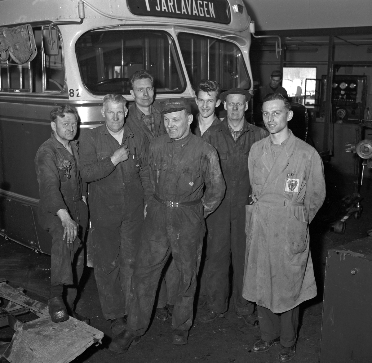 Bil & Buss i Gävle, verkstadspersonal samlade vid en Scania-Vabis buss