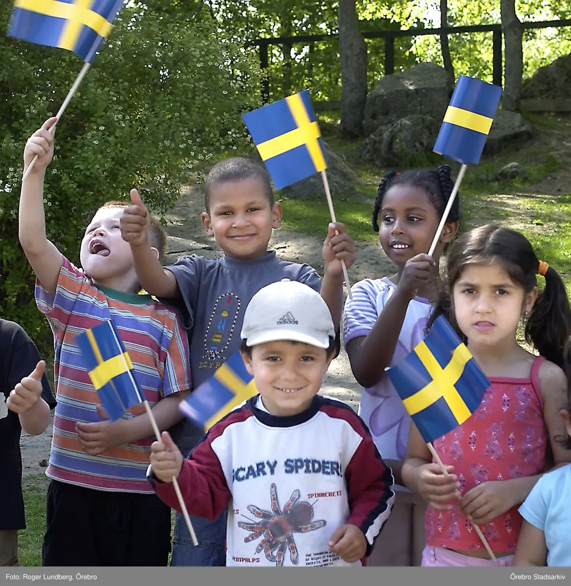 Barn firar med flaggor på Sveriges nationaldag, 2004-06-06