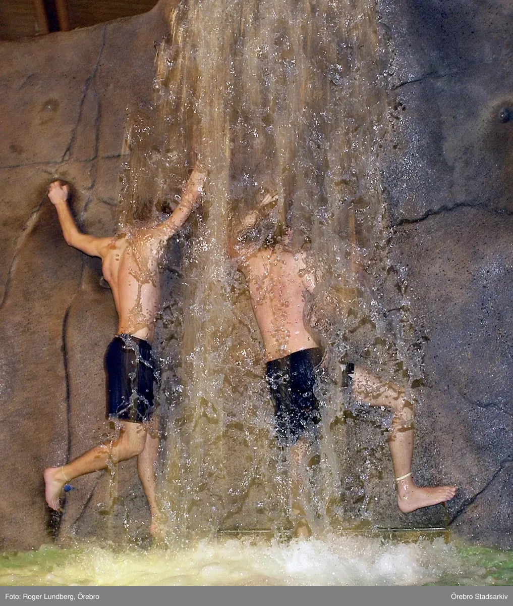 Unga män klättrar på klättervägen i Gustavsviksbadet, 2004