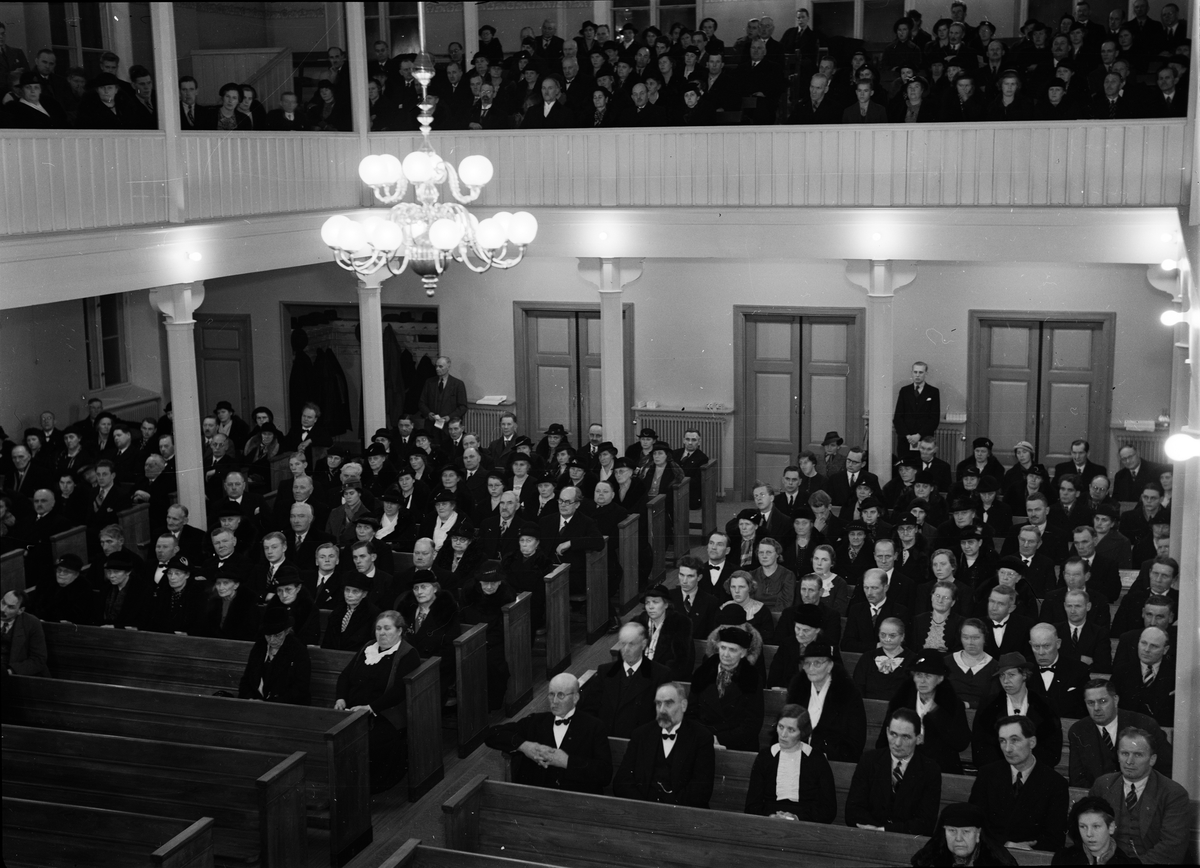 Gudstjänst eller möte i Uppsala missionskyrka, Kungsgatan, Uppsala november 1937