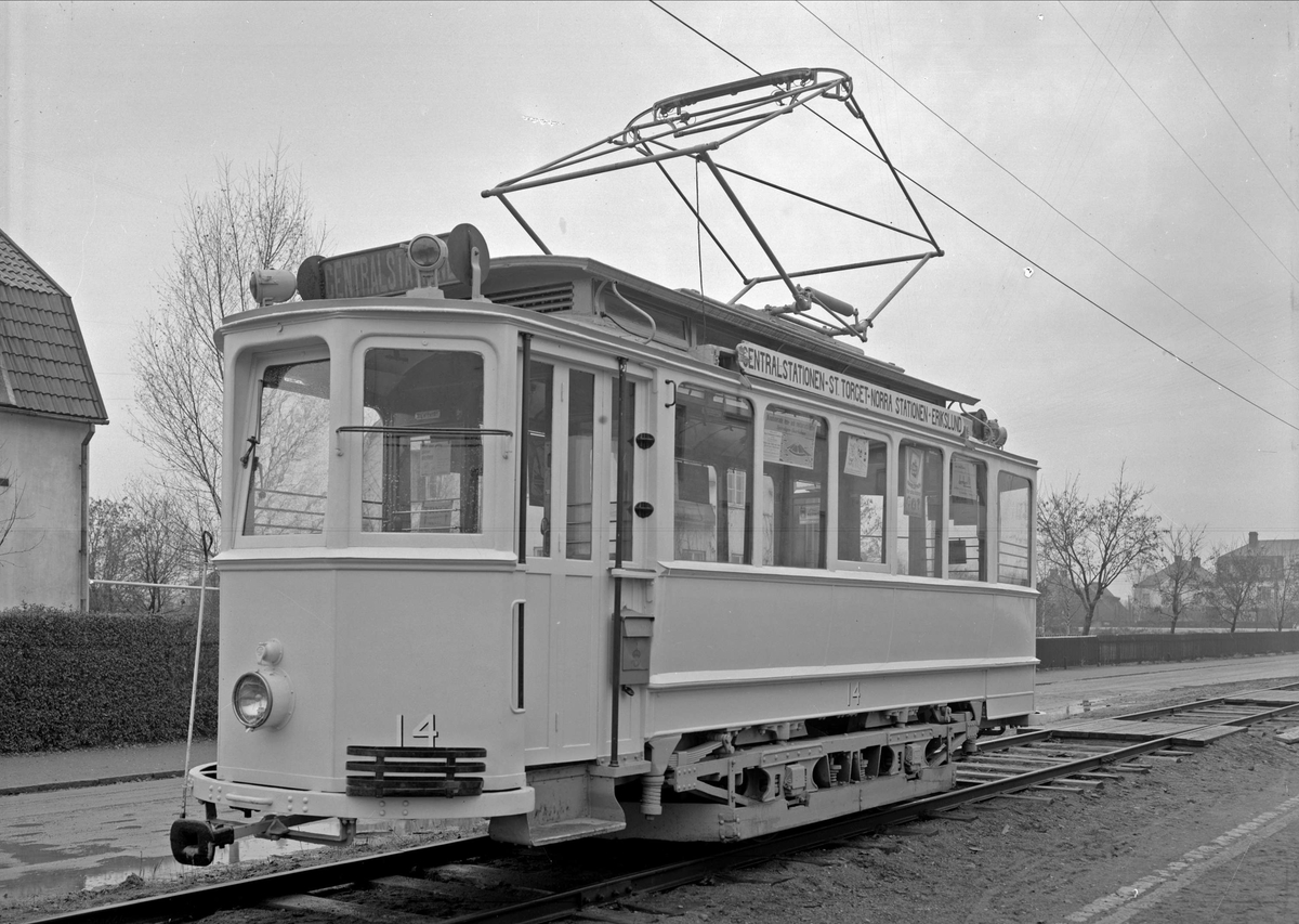 Spårvagn från Upsala Spårvägs AB vid ändhållplatsen på Norrlandsgatan, Uppsala