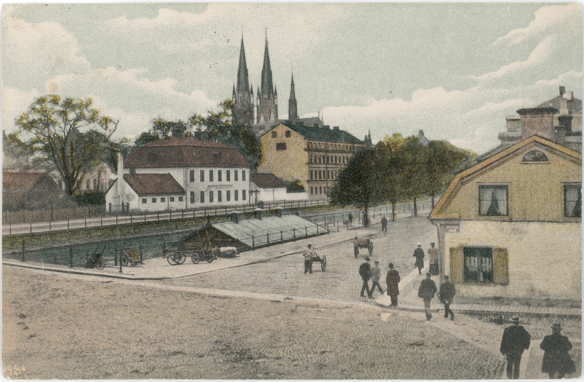 Vykort - vy över Östra Ågatan, Fyrisån och Västra Ågatan, Uppsala 1906
