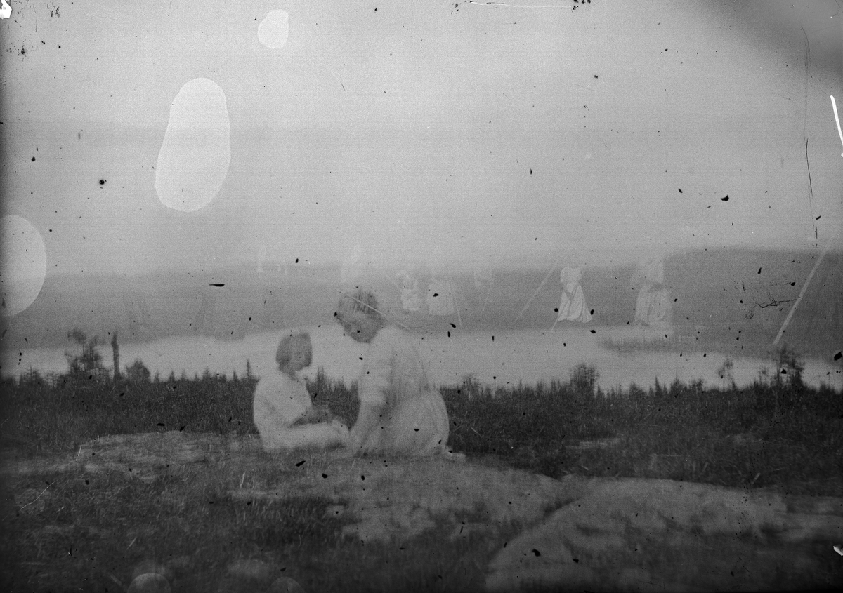 Kvinna och flicka sitter på berghäll, utsikt mot sjö sannolikt i norra Sverige