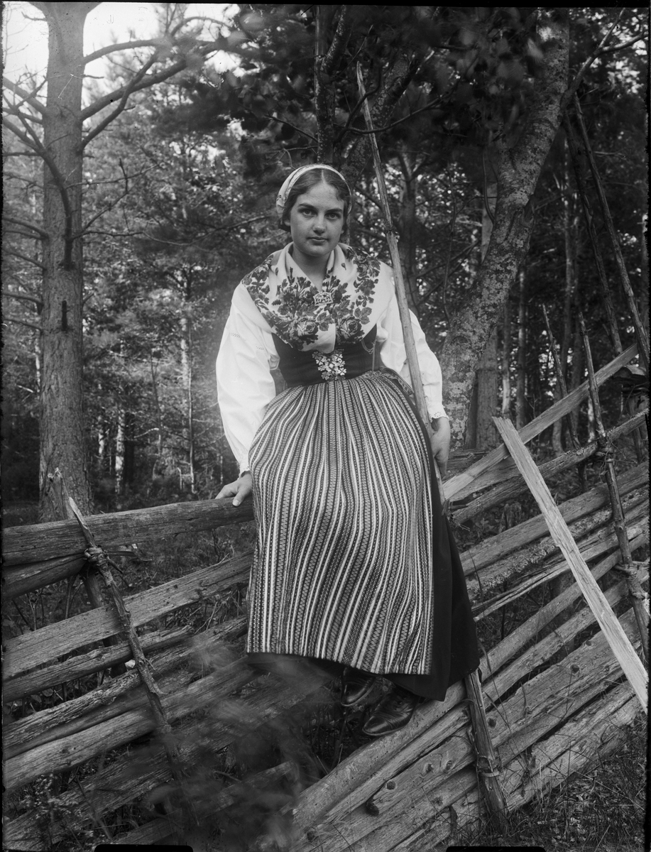 Kvinna i folkdräkt sitter på gärdesgård, Dalarna