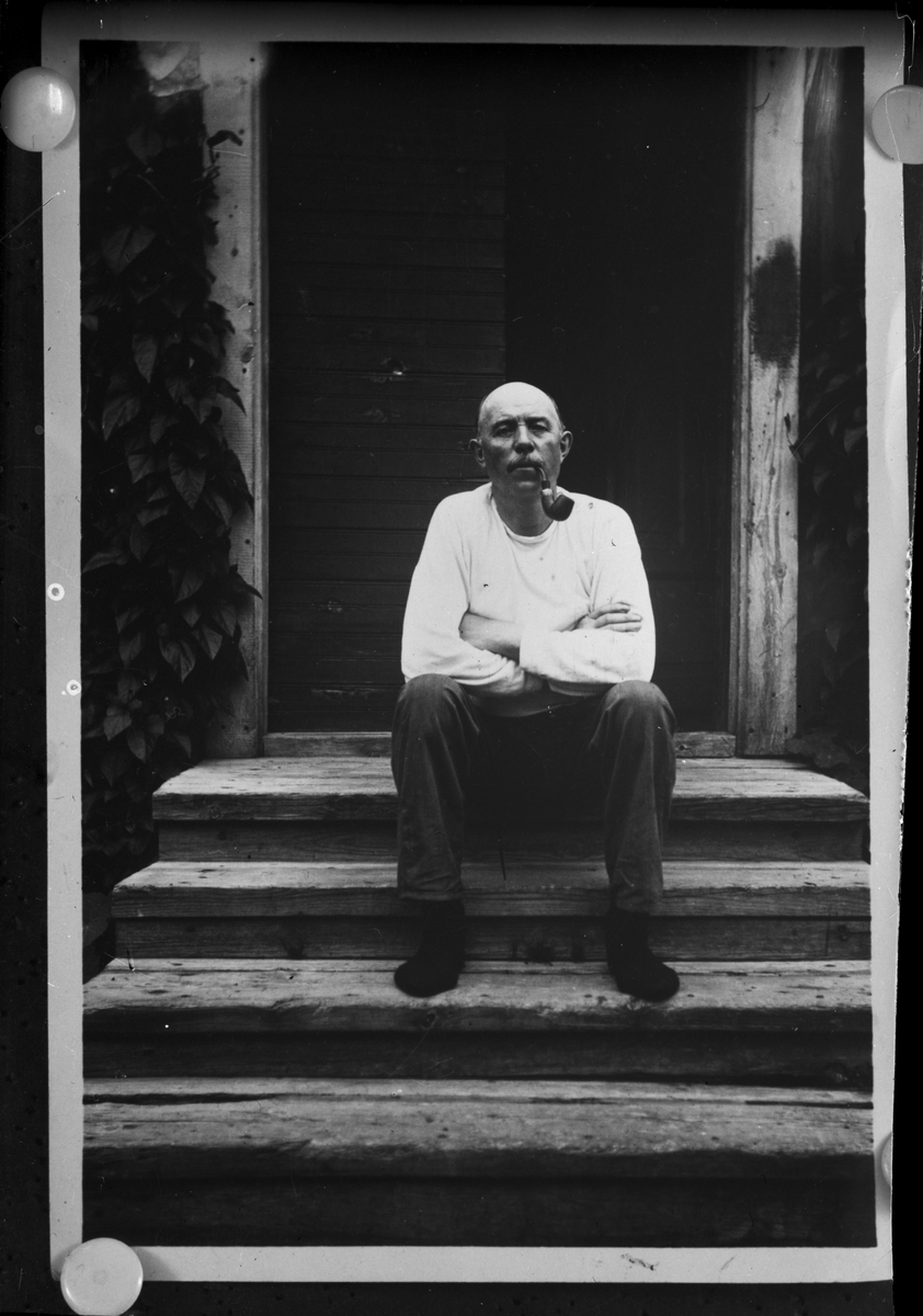 Reprofotografi - man sitter ute på trappan med pipa i munnen