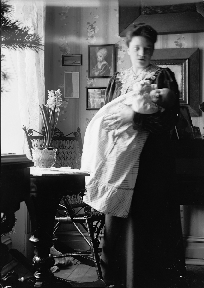 Titel: Barndop i hemmet, kvinna med spädbarn i famnen, i Sverige