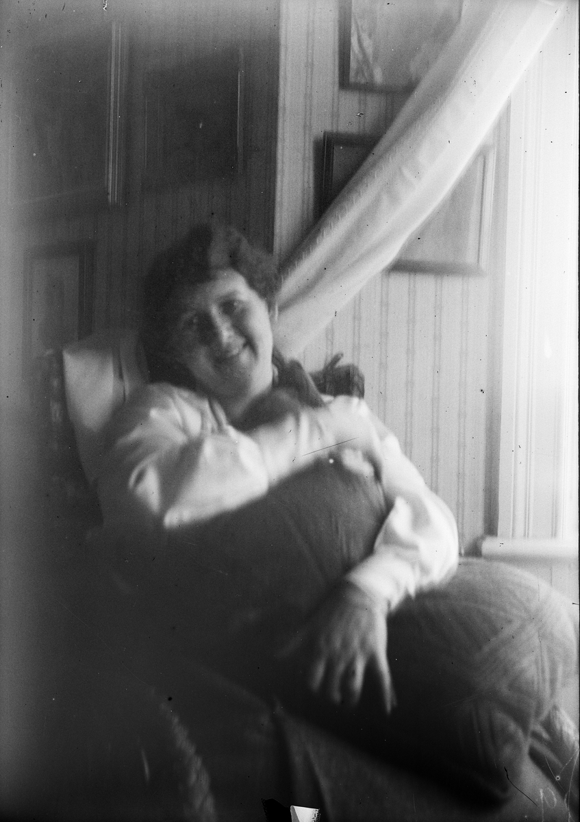 Kvinna sitter i stol med kudde i famnen, sannolikt i Sverige