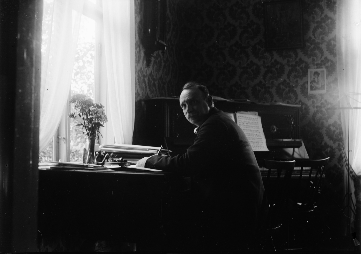 Tonsättaren Ruben Liljefors sitter vid skrivbordet och skriver, sannolikt i hemmet i Sverige