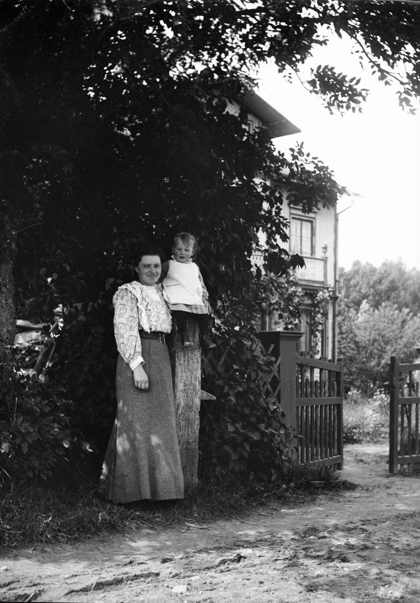 Christiane Liljefors med barn ute på gården vid grinden, sannolikt i Sverige