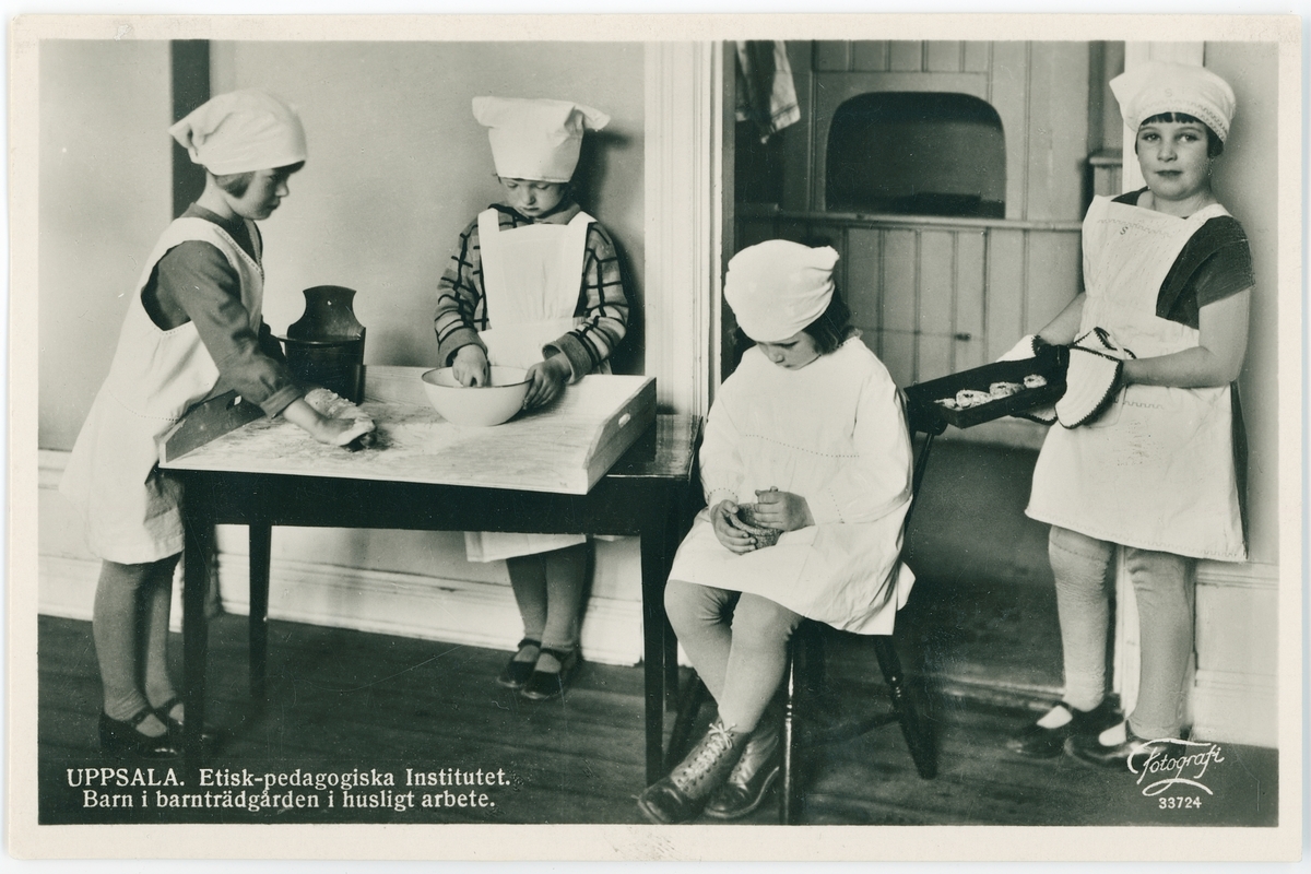 Vykort - barn i barnträdgården i husligt arbete, Uppsala