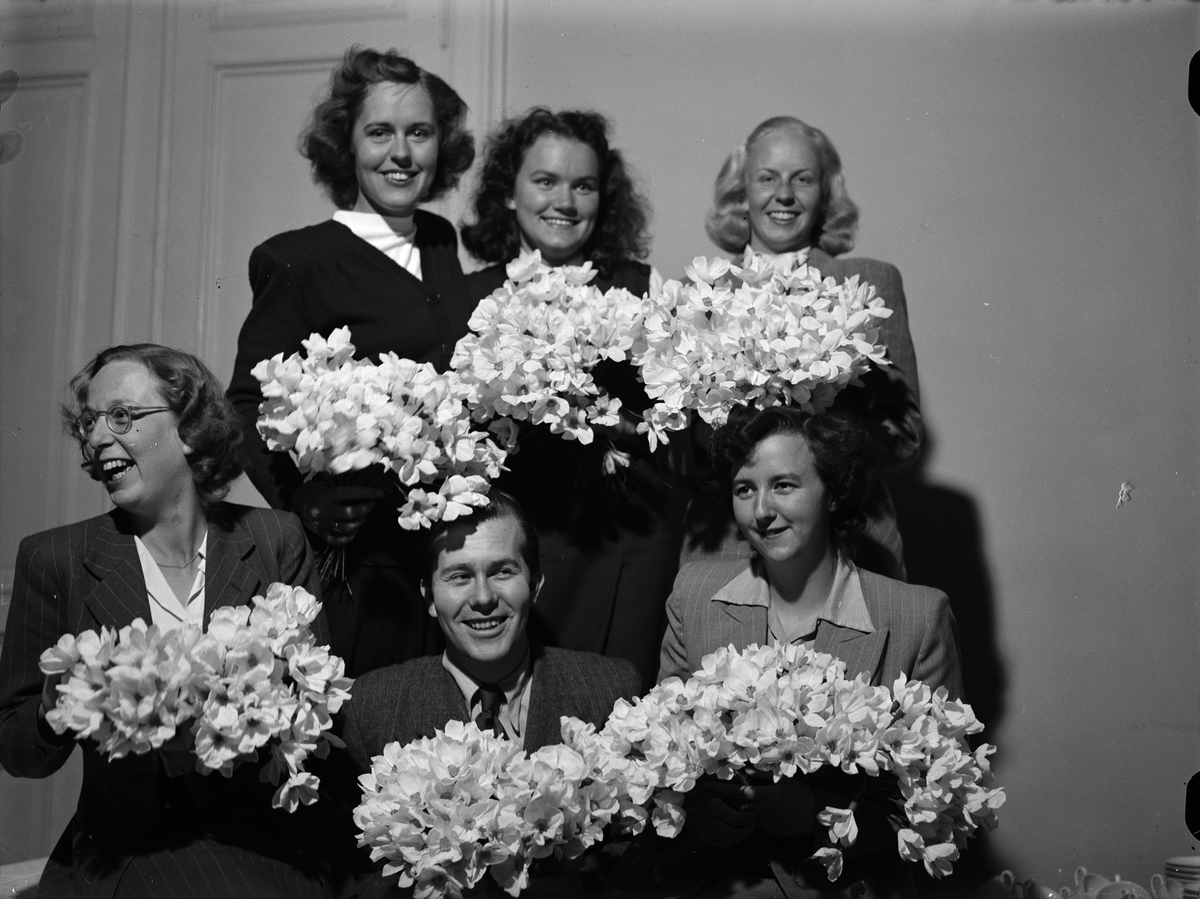 "Vårfestblomman slår ut" - studenter med vårfestblommor som de ska sälja på vårfestdagen i Uppsala maj 1945