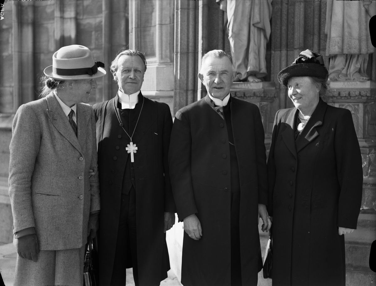 Grupporträtt med ärkebiskop Erling Eidem utanför Uppsala domkyrka 1945