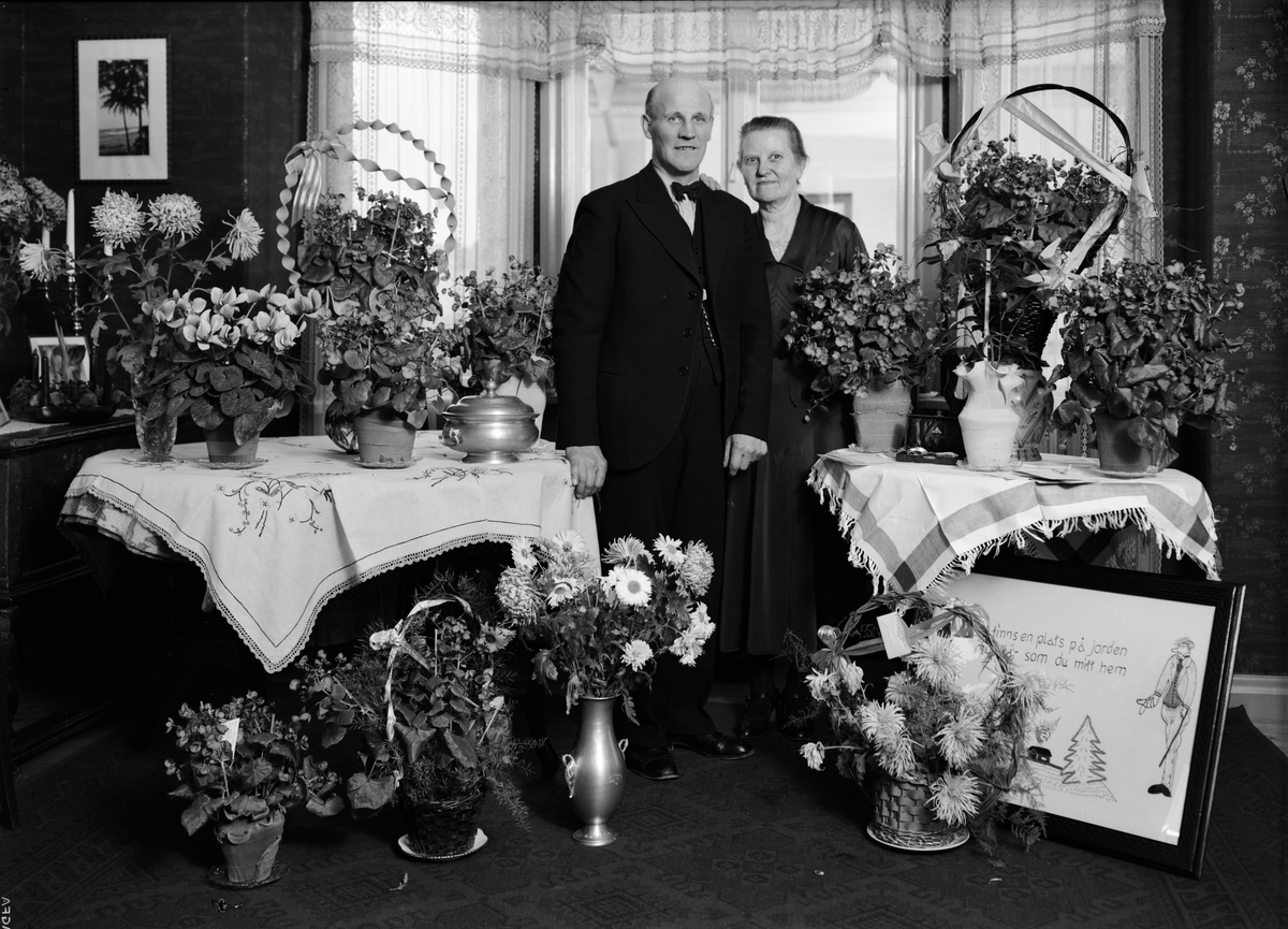 Födelsedagsporträtt - kvinna och man i hemmiljö, sannolikt Uppsala, 1935