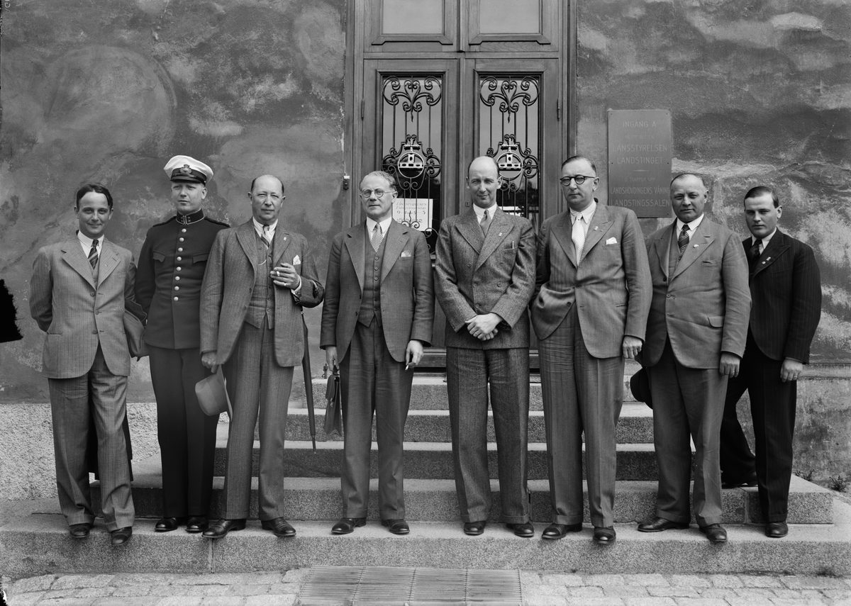 Grupporträtt - män utanför Uppsala slott, Uppsala juni 1938