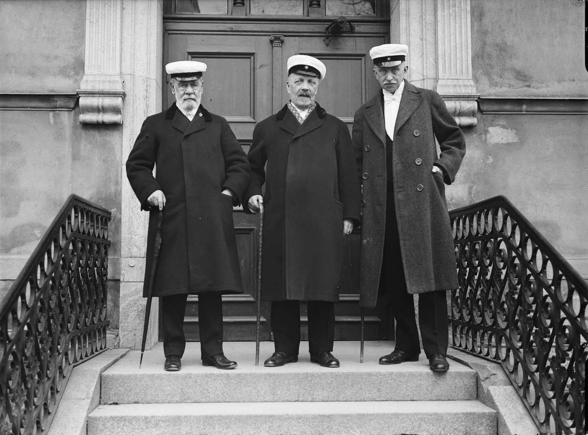 Tre äldre män med studentmössor, Uppsala, före 1933