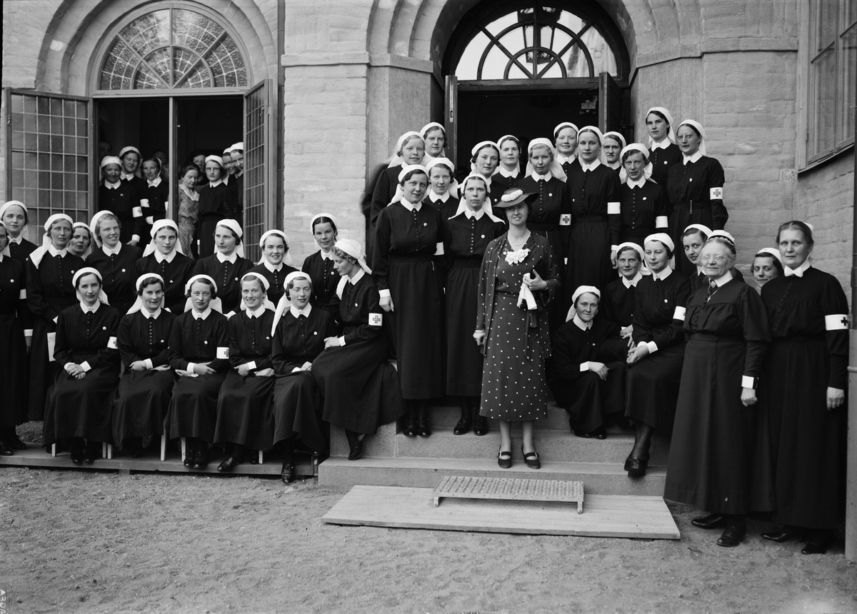 Grupporträtt - sjuksköterskor och prinsessan Sibylla framför sjuksköterske- och elevhemmet, Akademiska sjukhuset, Uppsala 1944