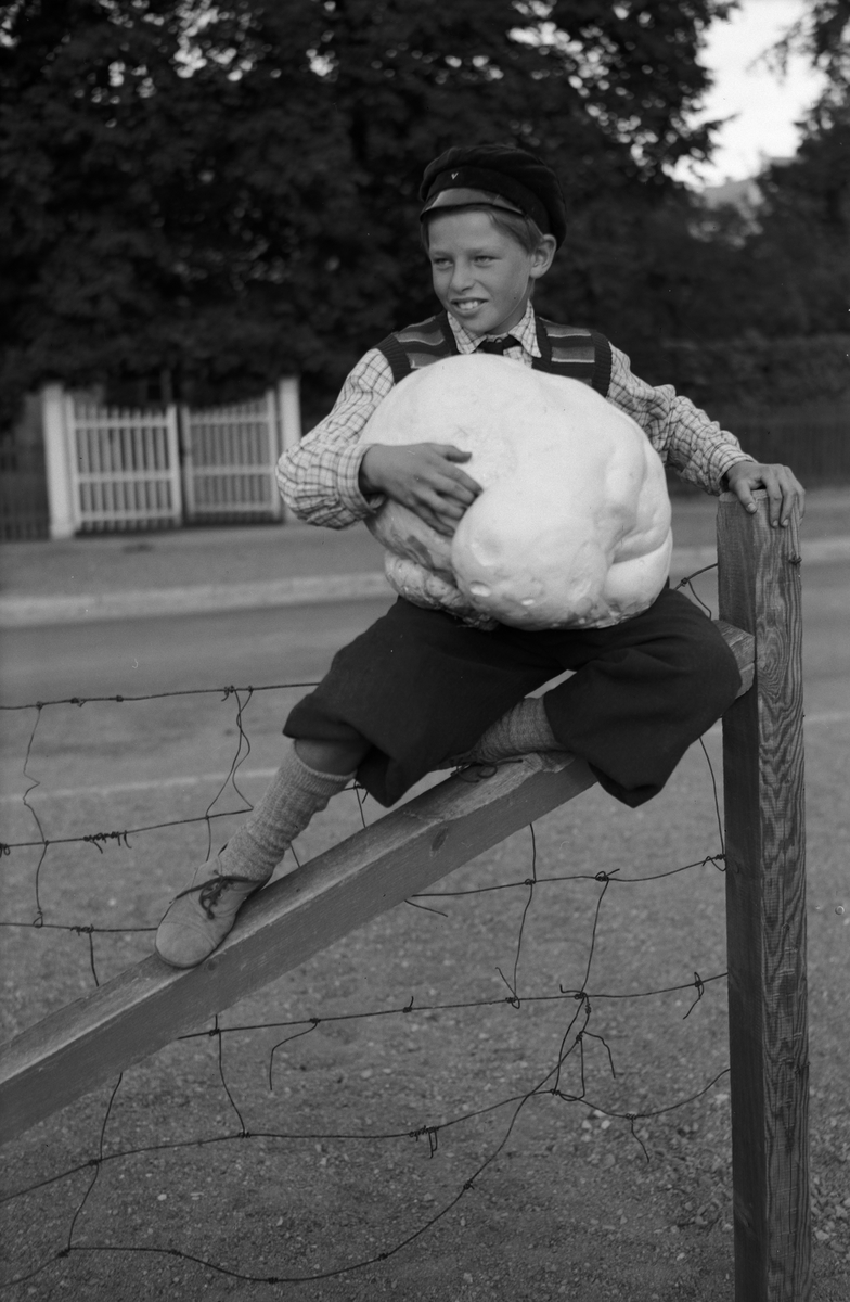 Pojke med jätteröksvamp från Järsta gård, Tensta socken, Uppland 1945