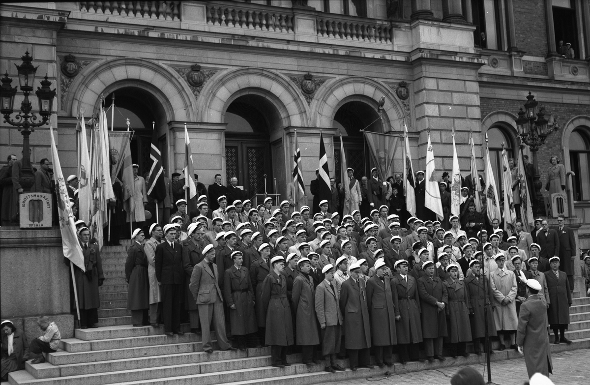 "Freden värdigt firad i Upsala", Allmänna sången sjunger "Stå stark du ljusets riddarvakt" på Universitetstrappan, Uppsala 8 maj 1945