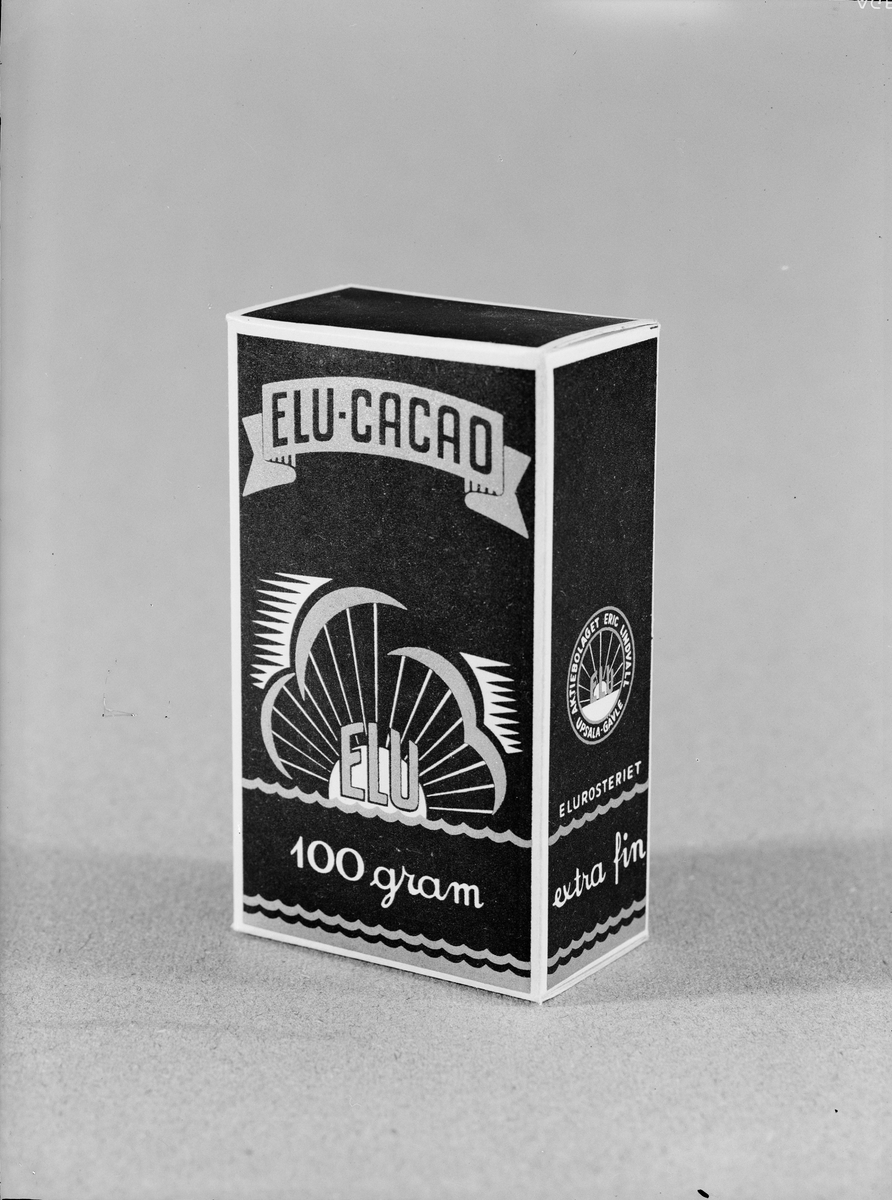Kakaoförpackning, "ELU-kakao", från AB Eric Lindvall och Elurosteriet, Kungsgatan, Uppsala oktober 1943