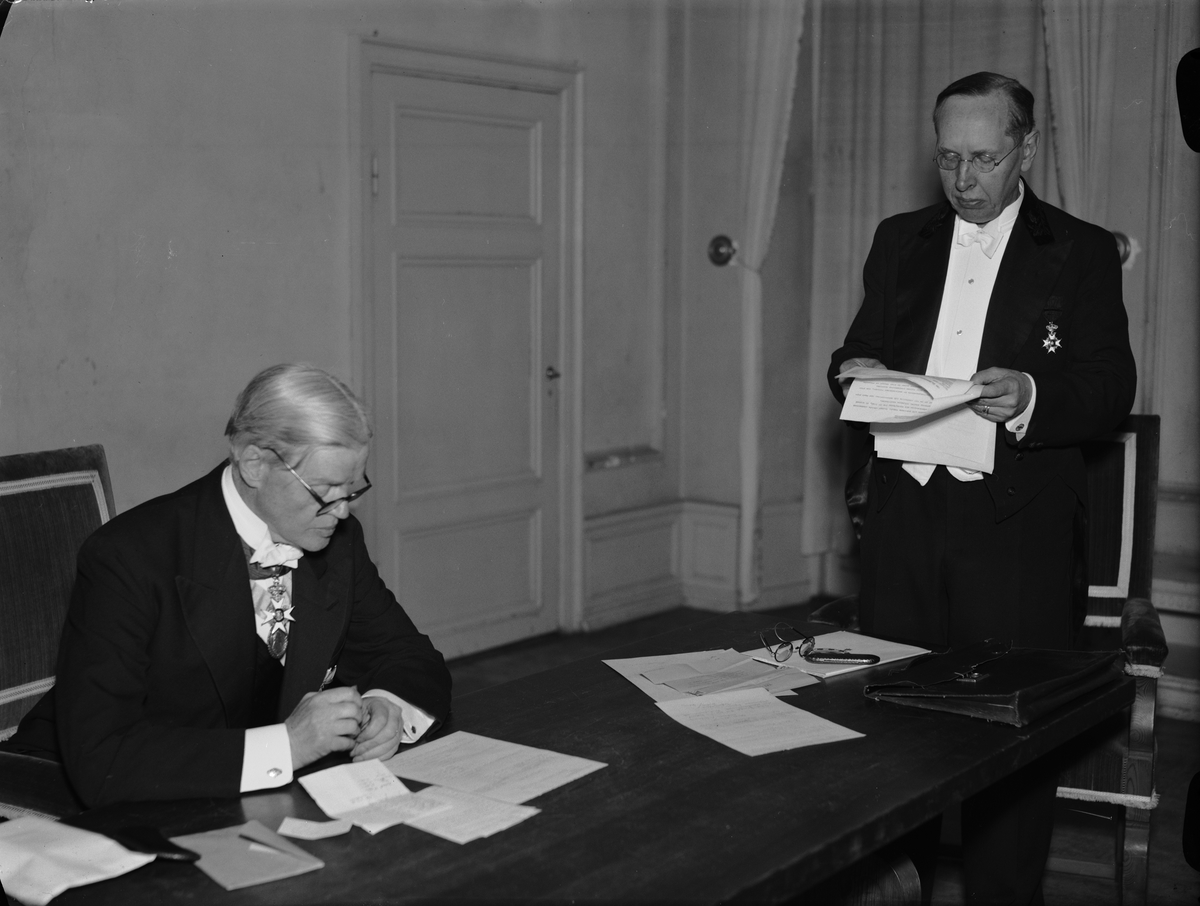 "Gustav Adolfsakademien firade glansfullt sitt tioårsjubileum" - högtidssammanträdets presidium, statsrådet K G Westman och professor Jöran Sahlgren, Värmlands studentnation, Uppsala november 1942