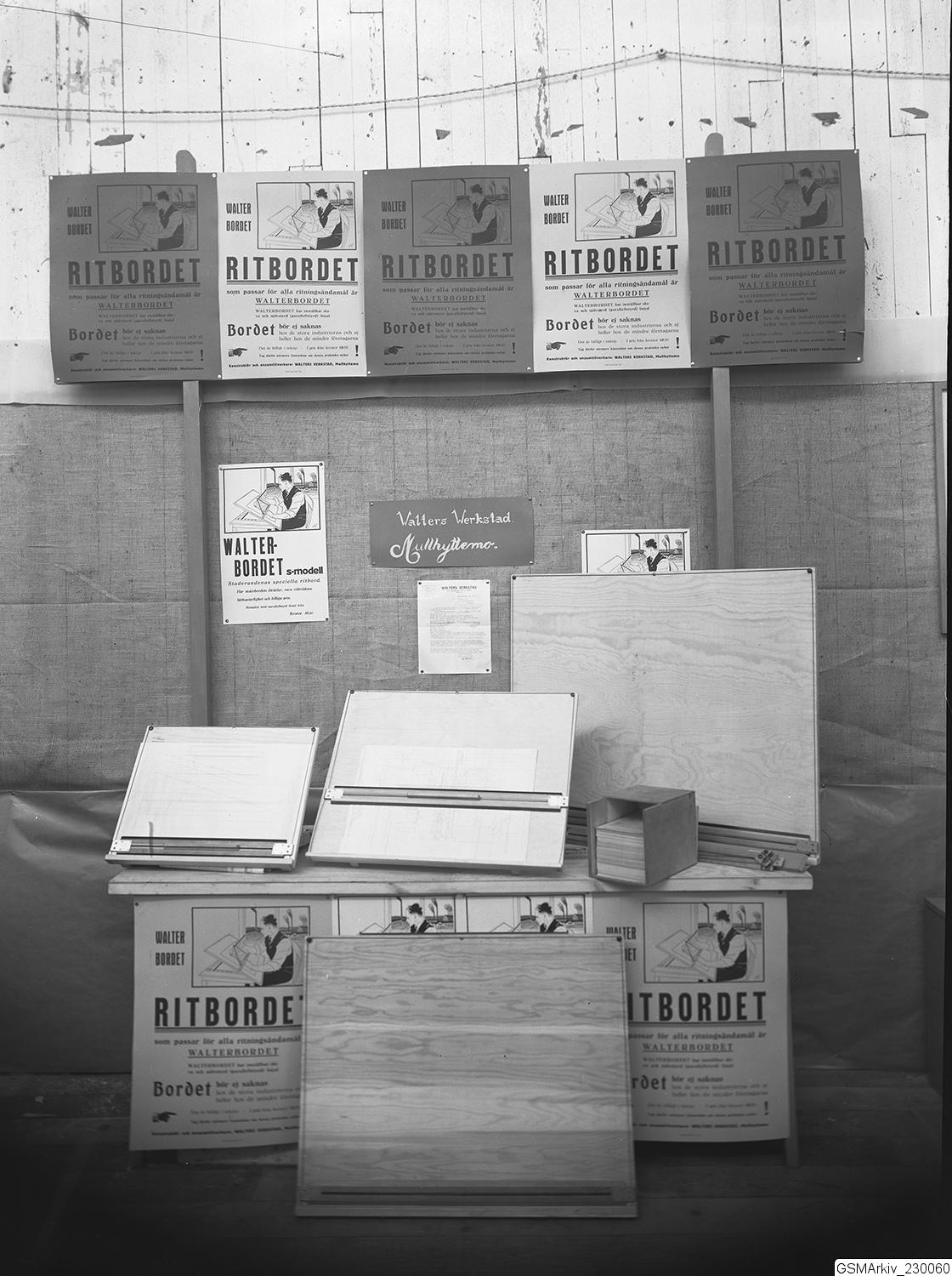 Utställningsmonter på Svenska Mässan med ritbord från Walters verkstad i Mullhyttemo