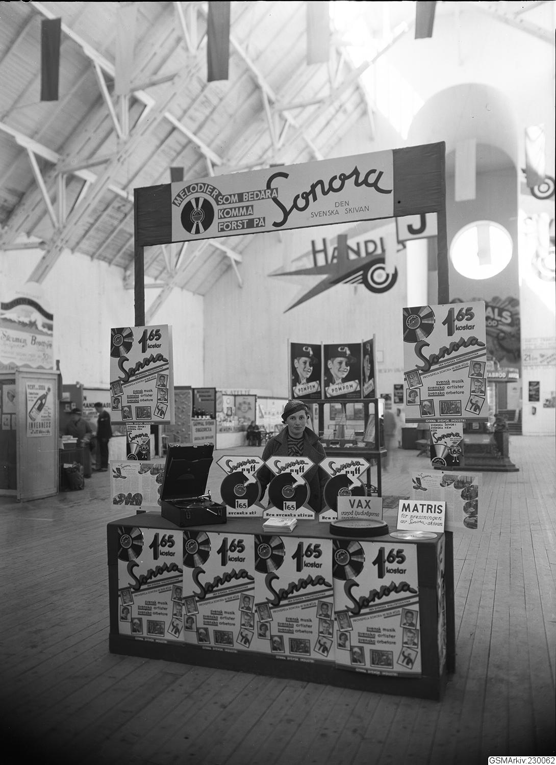 Utställningsmonter på Svenska Mässan, Sonora, Sveriges första skivbolag, grundat 1932 av Erik Ljungberg.