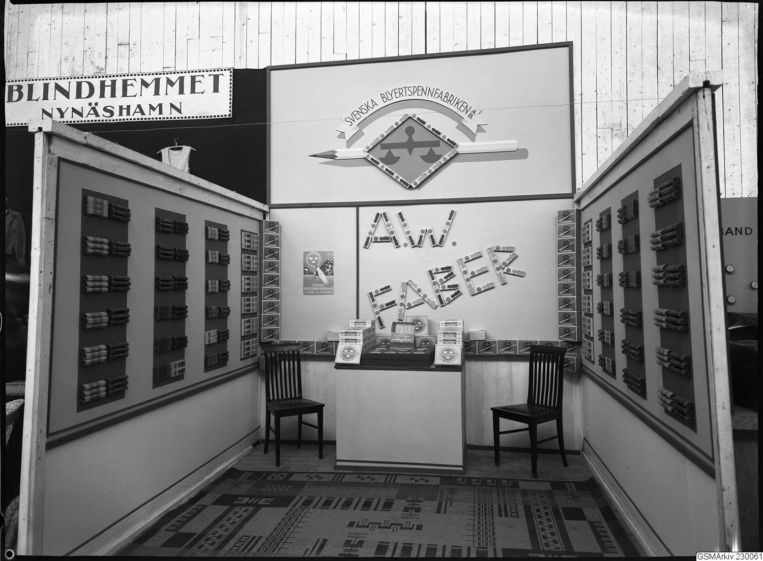 Utställningsmonter på Svenska Mässan med pennor från A. W. Faber och Svenska Blyertspennfabriken AB. Till vänster syns montern för Blindhemmet Nynäshamn.